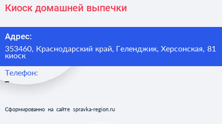 Киоск домашней выпечки по адресу 353460, Краснодарский край, Геленджик, Херсонская, 81 киоск в дальнейшем Организация, размещена в следующих категориях: