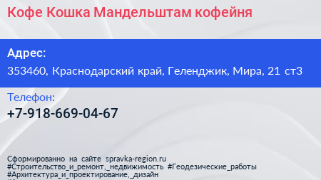 Кофе. Кошка. Мандельштам., кофейня по адресу 353460, Краснодарский край, Геленджик, Мира, 21 ст3 в дальнейшем Организация, размещена в следующих категориях: