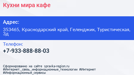 Кухни мира, кафе по адресу 353465, Краснодарский край, Геленджик, Туристическая, 3д в дальнейшем Организация, размещена в следующих категориях: