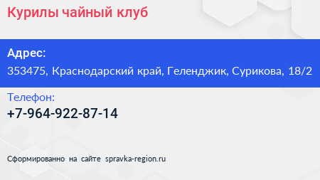 Курилы, чайный клуб по адресу 353475, Краснодарский край, Геленджик, Сурикова, 18/2 в дальнейшем Организация, размещена в следующих категориях: