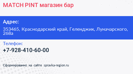 MATCH PINT, магазин-бар по адресу 353465, Краснодарский край, Геленджик, Луначарского, 268а в дальнейшем Организация, размещена в следующих категориях: