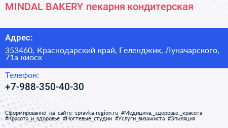 MINDAL BAKERY, пекарня-кондитерская по адресу 353460, Краснодарский край, Геленджик, Луначарского, 71а киоск в дальнейшем Организация, размещена в следующих категориях: