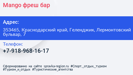 Mango, фреш-бар по адресу 353465, Краснодарский край, Геленджик, Лермонтовский бульвар, 7 в дальнейшем Организация, размещена в следующих категориях: