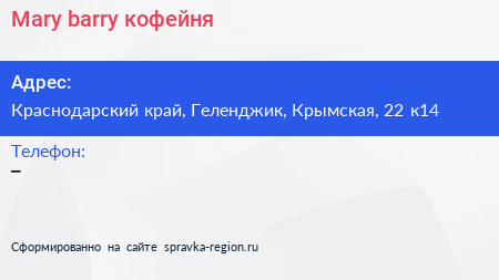 Mary barry, кофейня по адресу Краснодарский край, Геленджик, Крымская, 22 к14 в дальнейшем Организация, размещена в следующих категориях: