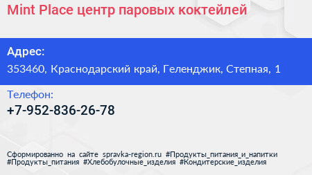 Mint Place, центр паровых коктейлей по адресу 353460, Краснодарский край, Геленджик, Степная, 1 в дальнейшем Организация, размещена в следующих категориях: