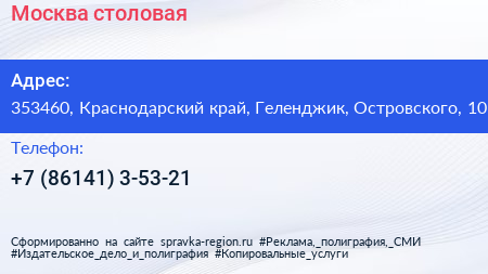 Москва, столовая по адресу 353460, Краснодарский край, Геленджик, Островского, 10 в дальнейшем Организация, размещена в следующих категориях: