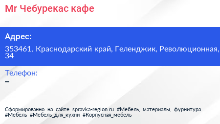 Mr.Чебурекас, кафе по адресу 353461, Краснодарский край, Геленджик, Революционная, 34 в дальнейшем Организация, размещена в следующих категориях: