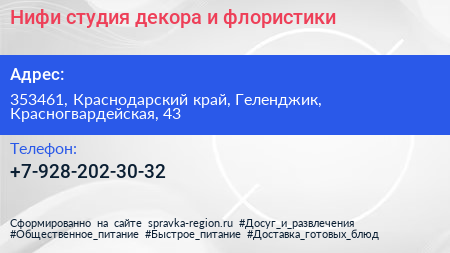 Нифи, студия декора и флористики по адресу 353461, Краснодарский край, Геленджик, Красногвардейская, 43 в дальнейшем Организация, размещена в следующих категориях: