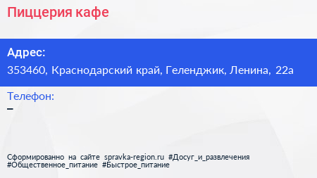 Пиццерия, кафе по адресу 353460, Краснодарский край, Геленджик, Ленина, 22а в дальнейшем Организация, размещена в следующих категориях: