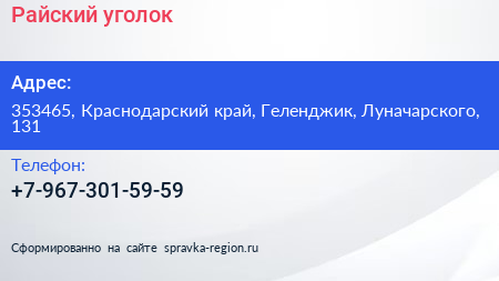 Райский уголок по адресу 353465, Краснодарский край, Геленджик, Луначарского, 131 в дальнейшем Организация, размещена в следующих категориях: