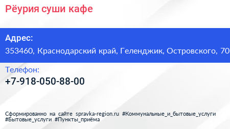 Рёурия, суши-кафе по адресу 353460, Краснодарский край, Геленджик, Островского, 70 в дальнейшем Организация, размещена в следующих категориях: