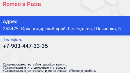 Romeo`s Pizza по адресу 353475, Краснодарский край, Геленджик, Шевченко, 3 в дальнейшем Организация, размещена в следующих категориях: