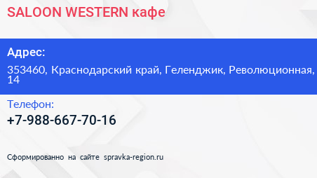 SALOON WESTERN, кафе по адресу 353460, Краснодарский край, Геленджик, Революционная, 14 в дальнейшем Организация, размещена в следующих категориях: