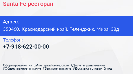 Santa Fe, ресторан по адресу 353460, Краснодарский край, Геленджик, Мира, 38д в дальнейшем Организация, размещена в следующих категориях: