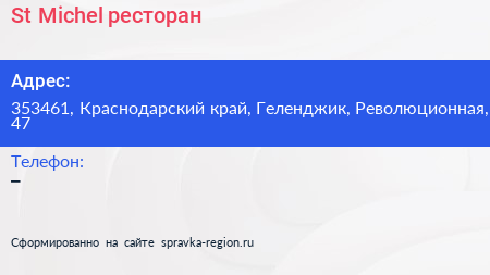 St.Michel, ресторан по адресу 353461, Краснодарский край, Геленджик, Революционная, 47 в дальнейшем Организация, размещена в следующих категориях:
