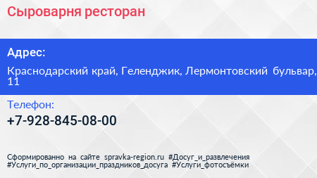 Сыроварня, ресторан по адресу Краснодарский край, Геленджик, Лермонтовский бульвар, 11 в дальнейшем Организация, размещена в следующих категориях: