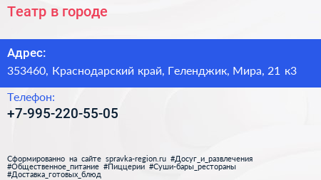 Театр в городе по адресу 353460, Краснодарский край, Геленджик, Мира, 21 к3 в дальнейшем Организация, размещена в следующих категориях: