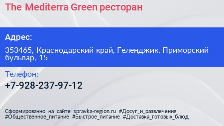 The Mediterra Green, ресторан по адресу 353465, Краснодарский край, Геленджик, Приморский бульвар, 15 в дальнейшем Организация, размещена в следующих категориях: