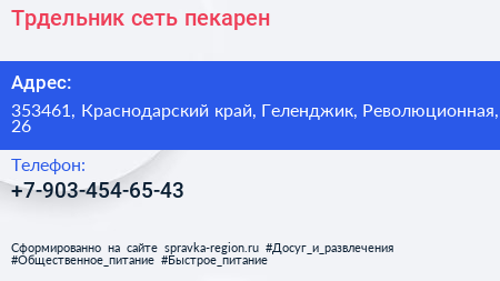 Трдельник, сеть пекарен по адресу 353461, Краснодарский край, Геленджик, Революционная, 26 в дальнейшем Организация, размещена в следующих категориях: