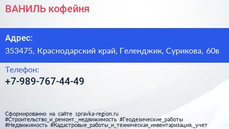 ВАНИЛЬ, кофейня по адресу 353475, Краснодарский край, Геленджик, Сурикова, 60в в дальнейшем Организация, размещена в следующих категориях: