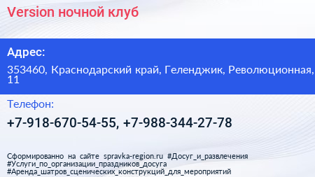 Version, ночной клуб по адресу 353460, Краснодарский край, Геленджик, Революционная, 11 в дальнейшем Организация, размещена в следующих категориях: