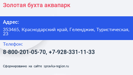 Золотая бухта, аквапарк по адресу 353465, Краснодарский край, Геленджик, Туристическая, 23 в дальнейшем Организация, размещена в следующих категориях: