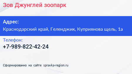 Зов Джунглей, зоопарк по адресу Краснодарский край, Геленджик, Куприянова щель, 1а в дальнейшем Организация, размещена в следующих категориях: