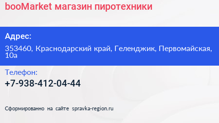 booMarket, магазин пиротехники по адресу 353460, Краснодарский край, Геленджик, Первомайская, 10а в дальнейшем Организация, размещена в следующих категориях: