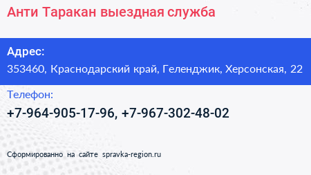 Анти Таракан, выездная служба по адресу 353460, Краснодарский край, Геленджик, Херсонская, 22 в дальнейшем Организация, размещена в следующих категориях: