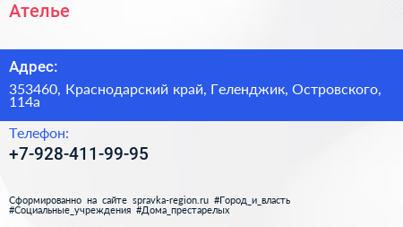 Ателье по адресу 353460, Краснодарский край, Геленджик, Островского, 114а в дальнейшем Организация, размещена в следующих категориях: