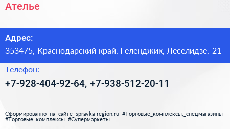 Ателье по адресу 353475, Краснодарский край, Геленджик, Леселидзе, 21 в дальнейшем Организация, размещена в следующих категориях:
