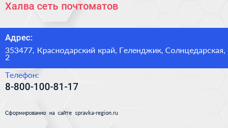 Халва, сеть почтоматов по адресу 353477, Краснодарский край, Геленджик, Солнцедарская, 2 в дальнейшем Организация, размещена в следующих категориях: