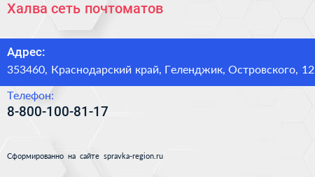 Халва, сеть почтоматов по адресу 353460, Краснодарский край, Геленджик, Островского, 12 в дальнейшем Организация, размещена в следующих категориях:
