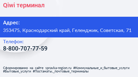 Qiwi, терминал по адресу 353475, Краснодарский край, Геленджик, Советская, 71 в дальнейшем Организация, размещена в следующих категориях:
