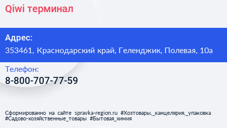 Qiwi, терминал по адресу 353461, Краснодарский край, Геленджик, Полевая, 10а в дальнейшем Организация, размещена в следующих категориях: