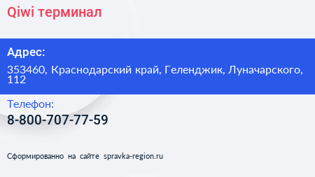 Qiwi, терминал по адресу 353460, Краснодарский край, Геленджик, Луначарского, 112 в дальнейшем Организация, размещена в следующих категориях: