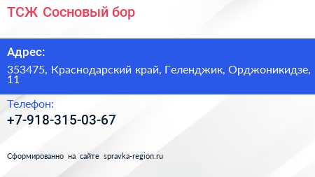 ТСЖ Сосновый бор по адресу 353475, Краснодарский край, Геленджик, Орджоникидзе, 11 в дальнейшем Организация, размещена в следующих категориях: