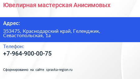 Ювелирная мастерская Анисимовых по адресу 353475, Краснодарский край, Геленджик, Севастопольская, 1а в дальнейшем Организация, размещена в следующих категориях:
