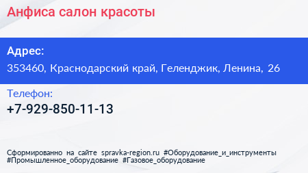 Анфиса, салон красоты по адресу 353460, Краснодарский край, Геленджик, Ленина, 26 в дальнейшем Организация, размещена в следующих категориях: