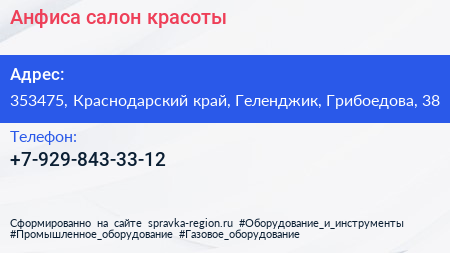 Анфиса, салон красоты по адресу 353475, Краснодарский край, Геленджик, Грибоедова, 38 в дальнейшем Организация, размещена в следующих категориях: