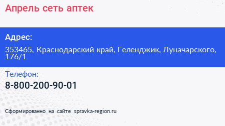 Апрель, сеть аптек по адресу 353465, Краснодарский край, Геленджик, Луначарского, 176/1 в дальнейшем Организация, размещена в следующих категориях: