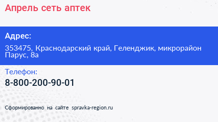 Апрель, сеть аптек по адресу 353475, Краснодарский край, Геленджик, микрорайон Парус, 8а в дальнейшем Организация, размещена в следующих категориях: