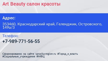 Art Beauty, салон красоты по адресу 353460, Краснодарский край, Геленджик, Островского, 149а/3 в дальнейшем Организация, размещена в следующих категориях: