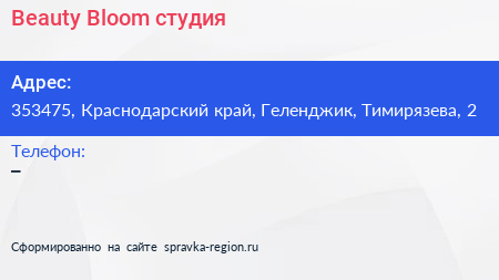 Beauty Bloom, студия по адресу 353475, Краснодарский край, Геленджик, Тимирязева, 2 в дальнейшем Организация, размещена в следующих категориях: