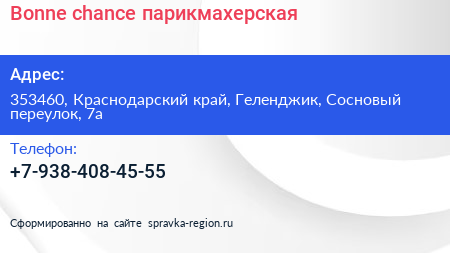 Bonne chance, парикмахерская по адресу 353460, Краснодарский край, Геленджик, Сосновый переулок, 7а в дальнейшем Организация, размещена в следующих категориях:
