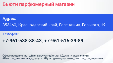 Бьюти, парфюмерный магазин по адресу 353460, Краснодарский край, Геленджик, Горького, 19 в дальнейшем Организация, размещена в следующих категориях: