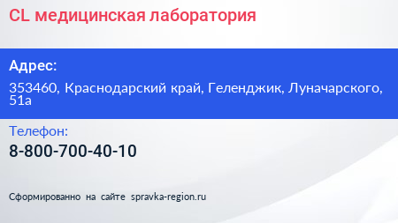CL, медицинская лаборатория по адресу 353460, Краснодарский край, Геленджик, Луначарского, 51а в дальнейшем Организация, размещена в следующих категориях: