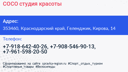 COCO, студия красоты по адресу 353460, Краснодарский край, Геленджик, Кирова, 14 в дальнейшем Организация, размещена в следующих категориях: