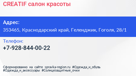 CREATIF, салон красоты по адресу 353465, Краснодарский край, Геленджик, Гоголя, 28/1 в дальнейшем Организация, размещена в следующих категориях: