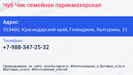 Чуб-Чик, семейная парикмахерская по адресу 353460, Краснодарский край, Геленджик, Халтурина, 11 в дальнейшем Организация, размещена в следующих категориях: